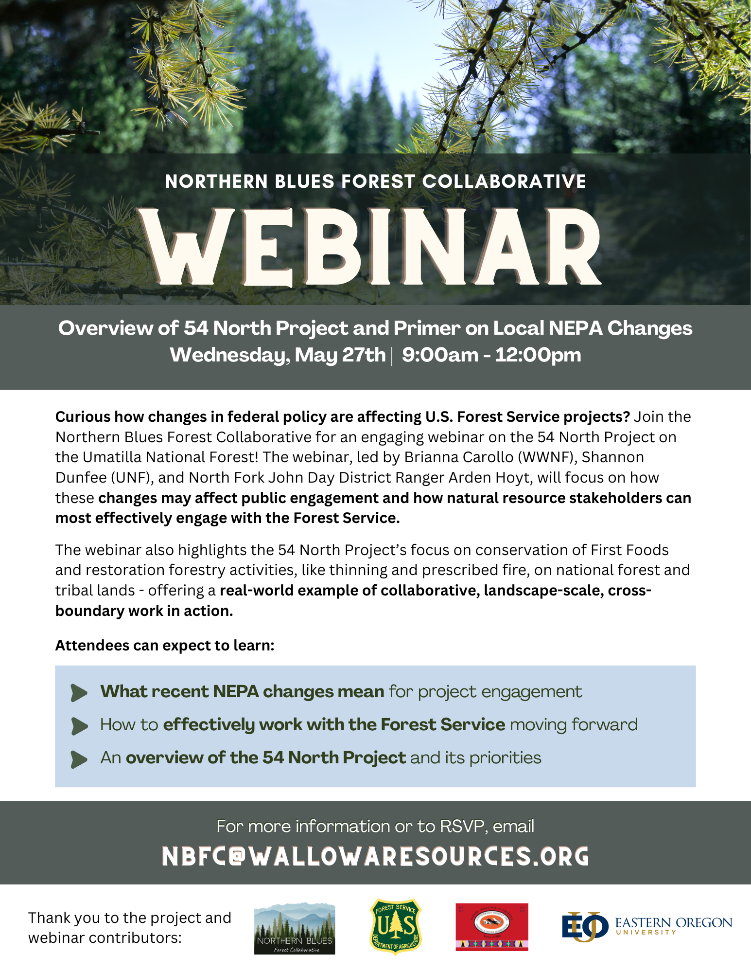 Curious how changes in federal policy are affecting U.S. Forest Service projects? Join the Northern Blues Forest Collaborative for an engaging webinar on the 54 North Project on the Umatilla National Forest! The webinar, led by Brianna Carollo (WWNF), Shannon Dunfee (UNF), and North Fork John Day District Ranger Arden Hoyt, will focus on how these changes may affect public engagement and how natural resource stakeholders can most effectively engage with the Forest Service.